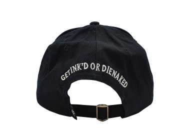 Hat: Black Fabric, low fit Front Logo: 3D inked & notorious embroidery on the front Back Side Logo: The famous Lauren Rose ink machine Inside: Inspired by the iconic and incorporates a vibrant Carlo Colluci color-inspired print on the two front panels Special Feature 1: A skull printed under the visor, extra space for a tattoo artist to sign the hat with her or his name. Special Feature 2: Small hidden black pocket with the famous Lauren Rose ink machine Back of the hat: This is a strapback, “get inked or die naked collection” (embroidered on the back)