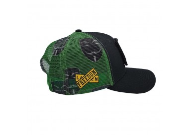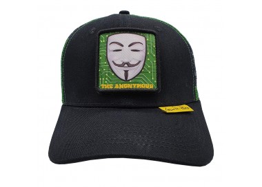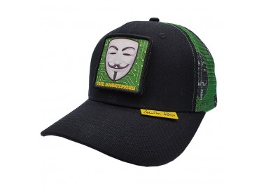 Anonymous also popularized the Guy Fawkes mask, a style adopted from V for Vendetta, as part of their identity in both the virtual and the real worlds. The Anonymous masks are also printed in black on the green mesh on the backside of the hat.