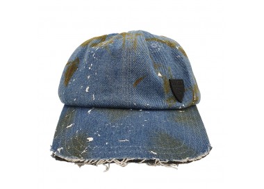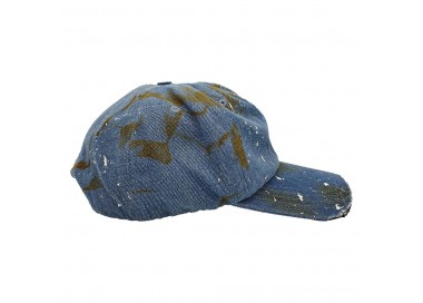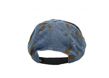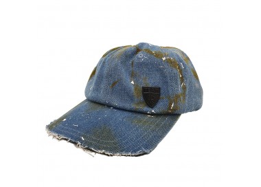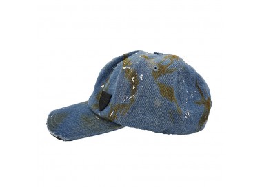 Hat: Denim fabric, low off fit, Front Logo: TEAM LR PLATE Special Feature: Damaged curved visor Back of the hat: This is a snapback Special feature of the hat: brown and white handmade spots Visor: Totally Damaged on the front Inlining: Lauren Rose inlining