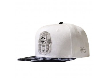 Deze witte anonymous Egypte farao gecombineerde tone in tone pet is tekenend voor onze nieuwe tijd. De groep Anonymous adopteerde het masker van Guy Fawkes voor hun protesten tegen de autoriteiten. Lauren Rose ontwikkelde deze pet met het masker aan de voorkant en het Oog van Ra is aan de zijkant van deze pet.